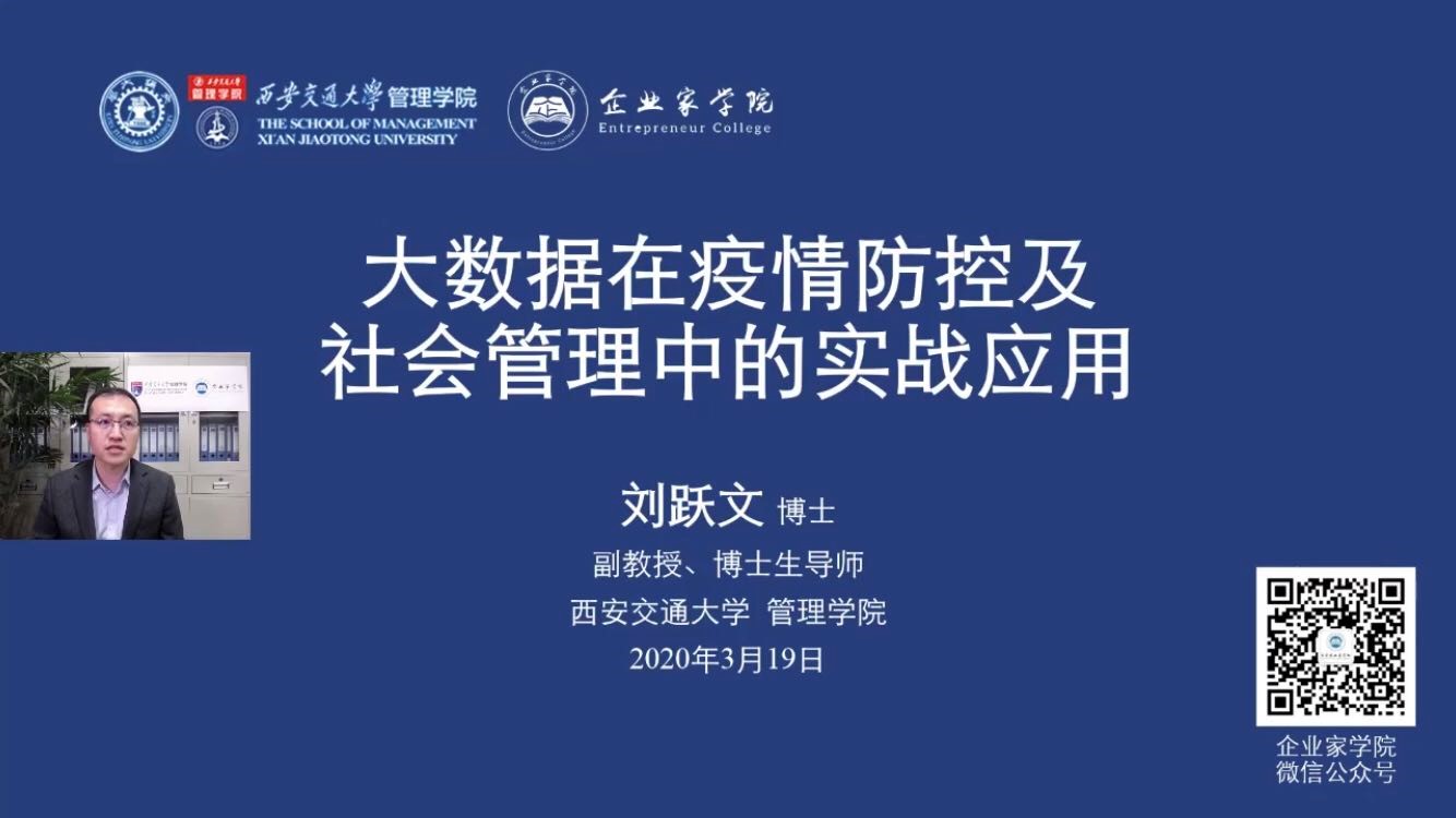 为进一步助力打好疫情防控攻坚战,推动有序复工复产,3月19日,西安交通大学管理学院、企业家学院联合西安市委组织部、西安市委统战部、西安市工商联成功举办了第二期网络直播大讲堂培训。西安交通大学管理学院副教授、云南省公安厅大数据专家组组长刘跃文博士以“大数据在疫情防控及社会管理中的实战应用”为题,分享疫情发生以来大数据助力云南省科学抗疫的技术成果与实践案例,并与在线人员进行了互动交流,受到了广泛好评。全市公务员、企事业单位中层干部以及社区、村两委会成员参加培训,在线人数达到两万多人次。