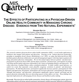 该研究成果以《医生主导的在线医疗社区在慢性病管理中的作用:来自两个自然实验的证据》为题发表在《管理信息系统季刊》(MIS Quarterly)上。其核心理论为在线医疗社区相关研究引入了一种新的在线医疗模式,通过开发一个概念框架,揭示了医生主导的在线医疗社区在慢性病管理中作用的理论机制。在实践上为如何加强患者-医生合作关系、缓解慢性病管理负担和改善医患关系提供了重要的建议。