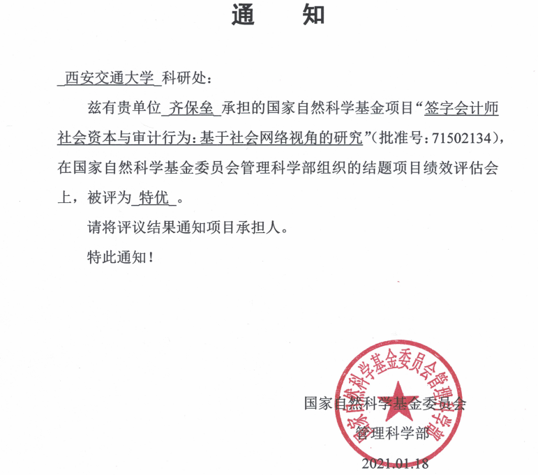 我院齐保垒老师承担的国家自然科学基金项目“签字注册会计师社会资本与审计行为:基于社会网络视角的研究”(批准号:71502134)被国家自然科学基金委员会管理学部评为“特优”。在该基金的资助下,齐保垒老师和团队成员在The Accounting Review(UTD24)、Accounting Horizons(国际A类期刊)、Auditing: A Journal of Practice and Theory(国际A类期刊)、Journal of Accounting and Public Policy(国际A类期刊)、Accounting and Business Research(国际B类期刊)、International Journal of Accounting(国际B类期刊)、Accounting and Finance(SSCI期刊)、Asia-Pacific Journal of Accounting and Economics(SSCI期刊)、《系统工程理论与实践》、《管理科学》、《管理评论》等国内外著名期刊发表论文20多篇,获得国内外同行的认可。2020年1月开始,齐保垒老师担任国际著名学术期刊Asia-Pacific Journal of Accounting and Economics 副主编。